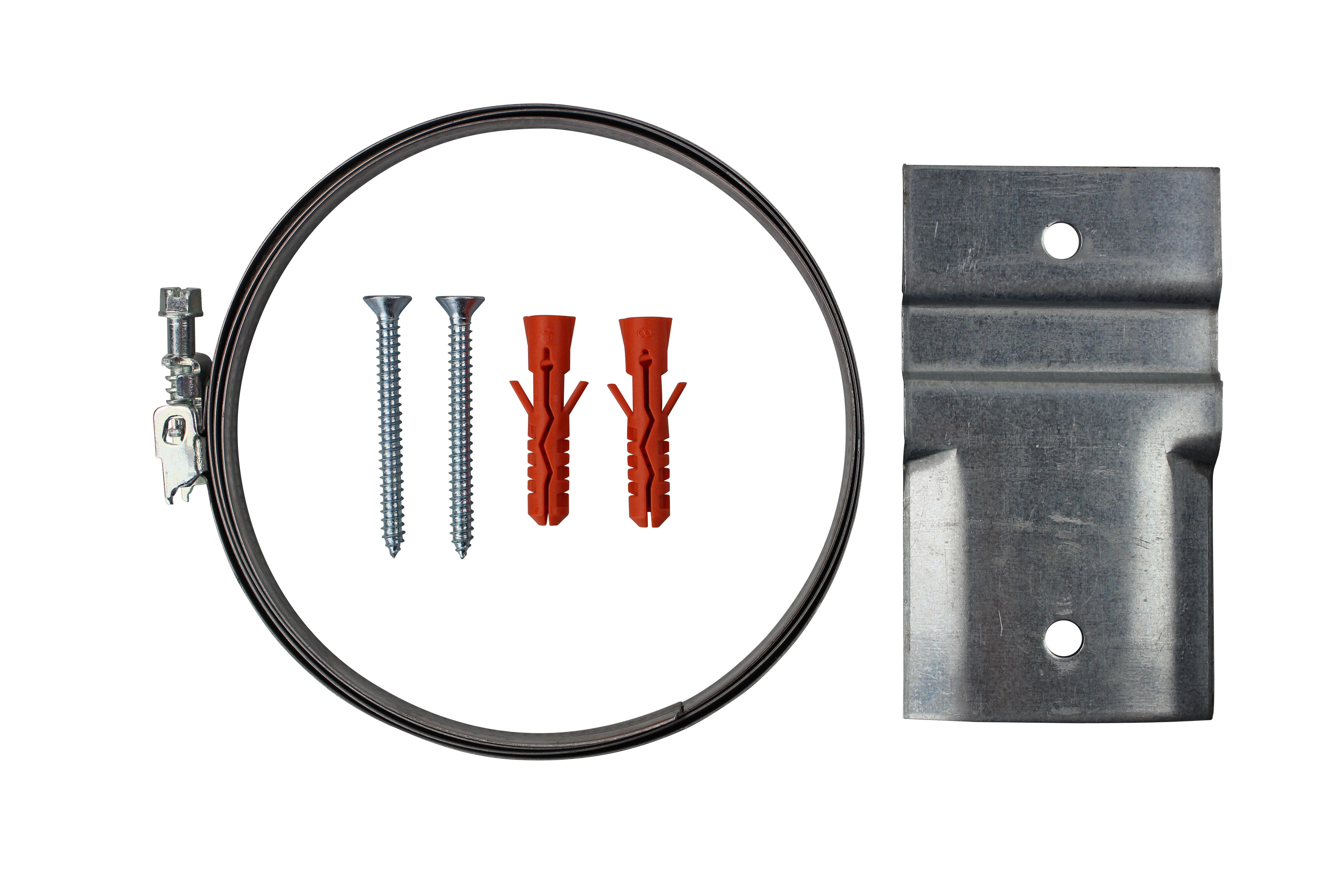 Montageplatte, Spannband (Funktion ähnlich einer Schlauchschelle), 2 Schrauben, 2 Dübel