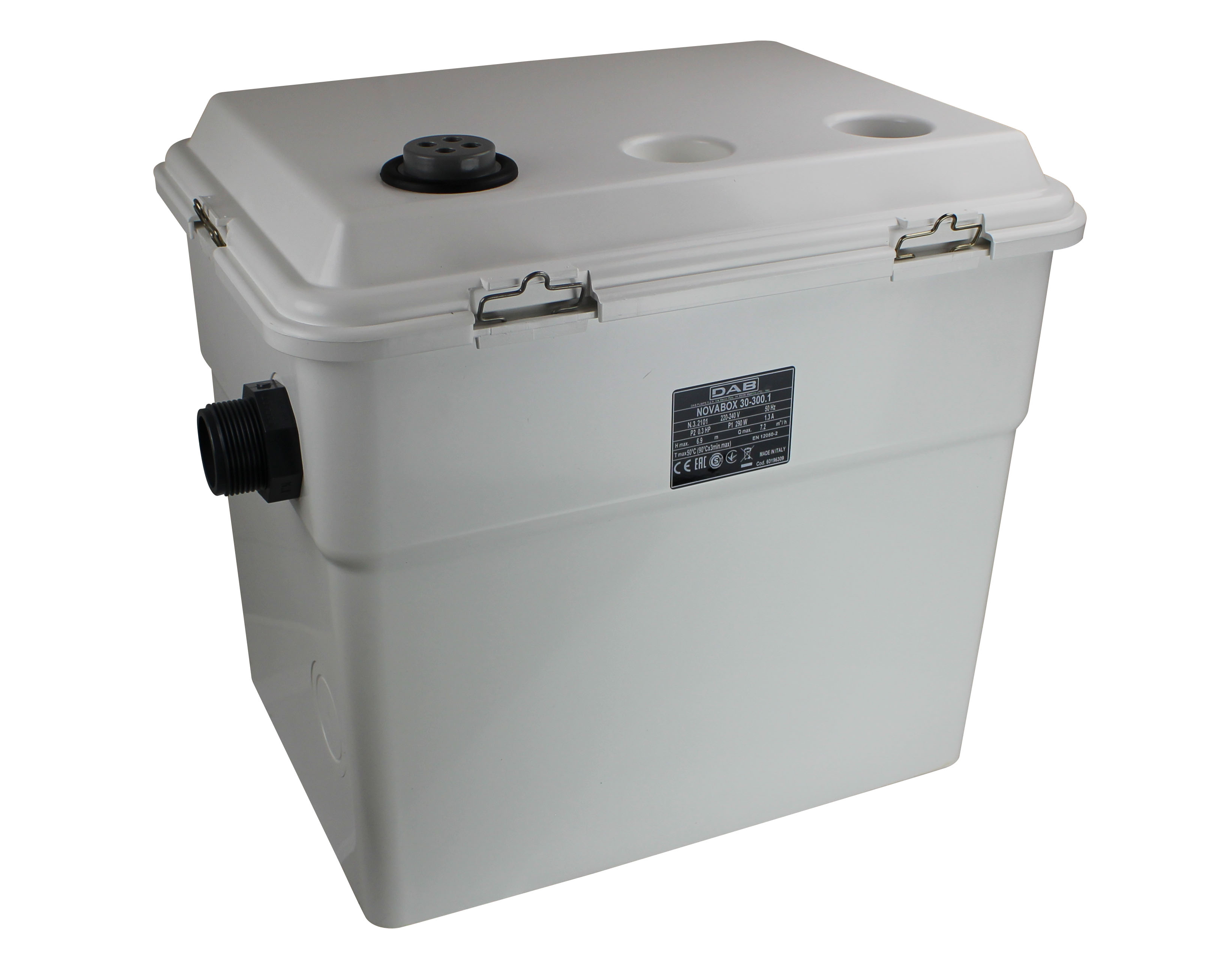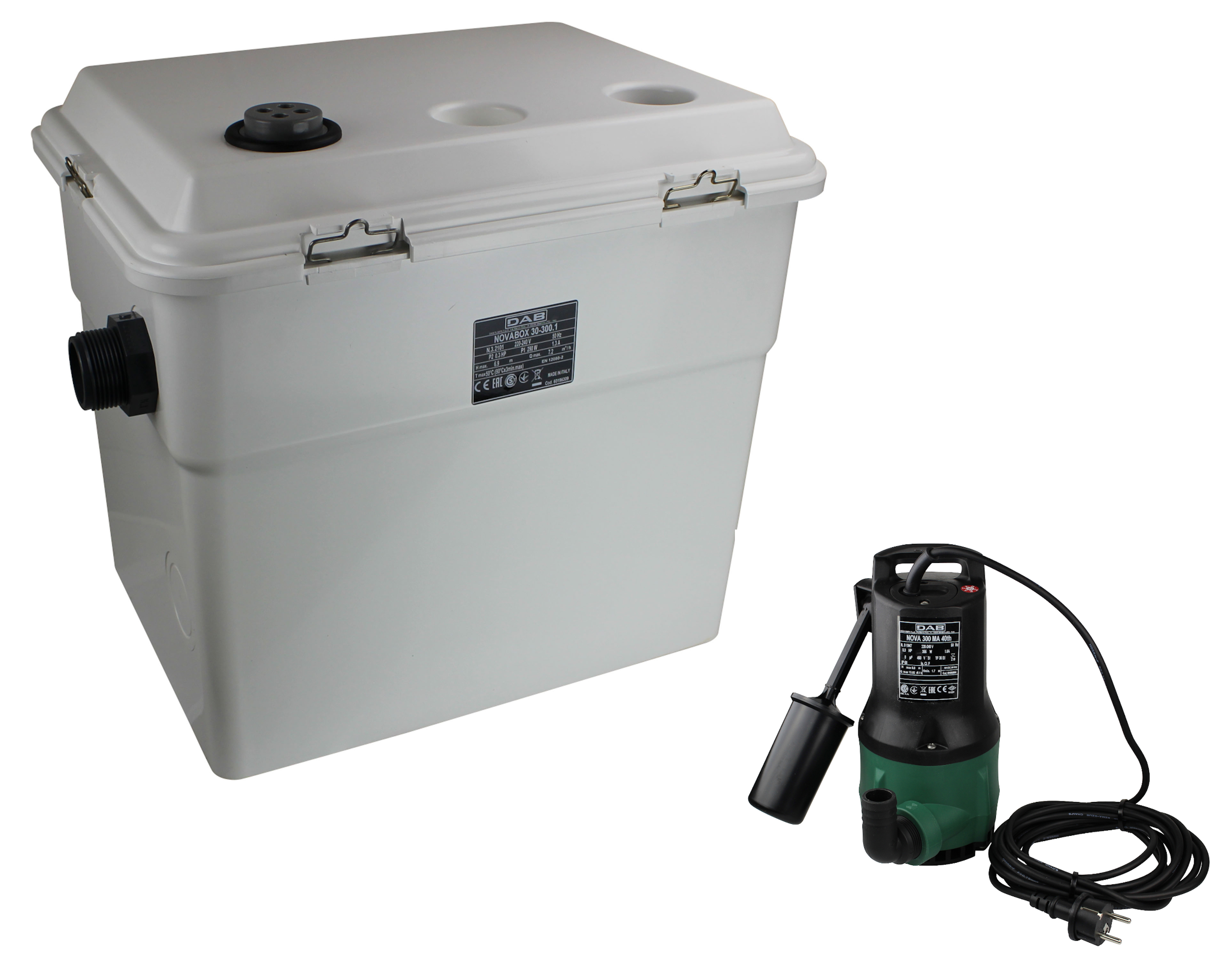 Diese DAB-Hebeanlage (DAB ist eine Grundfos-Tochterfirma) aus Italien die wir Ihnen hier anbieten, ist für das automatische Speichern und Pumpen von Haushaltsabwasser aus Badewannen, Waschbecken, Duschen und Waschmaschinen, die sich in Kellergeschoßen, bzw. unter dem Niveau der Kanalisierung befinden geeignet. Sie besteht aus einer Elektropumpe NOVA 300 (Sonderausführung) mit 5 Meter Kabel und Stecker, einem 30 Liter Behälter aus Technopolymer und einem Druckstutzen mit integrierter Rückschlagklappe. Die Anlage wird mit Pumpe, Fittingen und zusätzlichem Duschschwimmer (für niedrigeres Schaltniveau) geliefert.