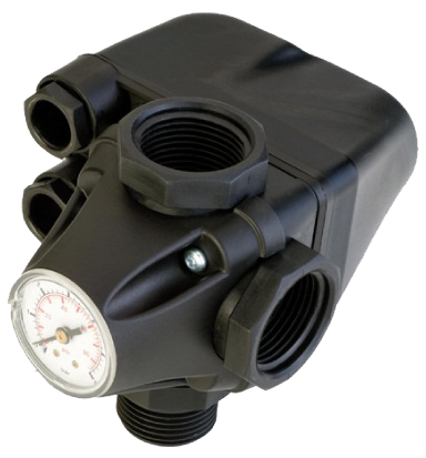Druckschalter zum automatischen Ein- und Auschalten von Wasserpumpen. Startet und stoppt die Pumpe in Abhängigkeit von Öffnung bzw. Schließung der Verbraucher. Sowohl Ein- als auch Auschaltdruck sind individuell einstellbar. Ein Manometer ist eingebaut, ebenso ein 3-Wegestück mit 1-Zollanschlüssen (1 x 1"AG für Pumpe und 2x 1"IG für Druckkessel und Einspeisung in die Hausversorgung).