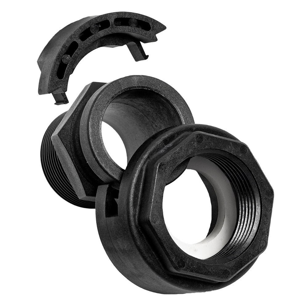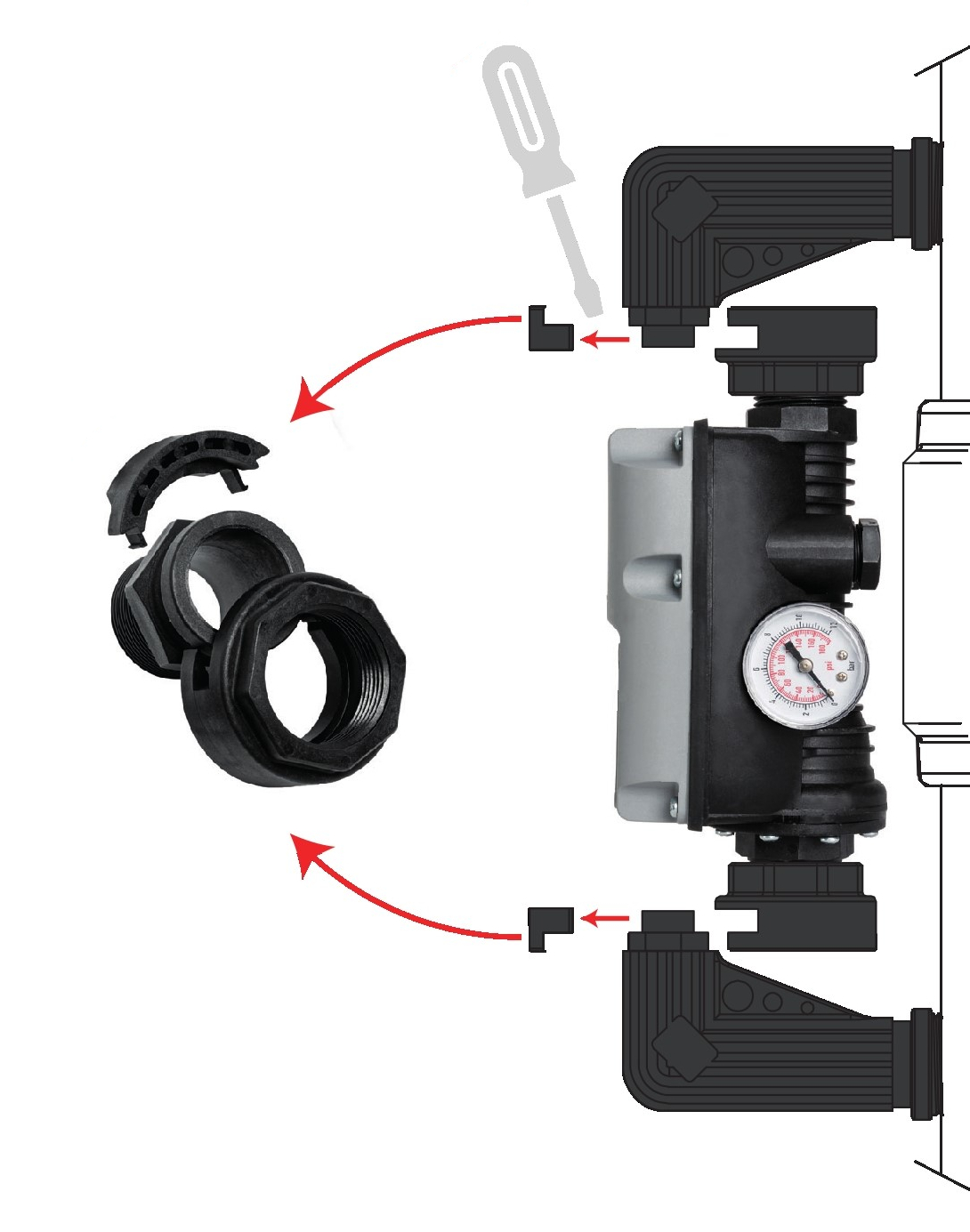 Diese lösbaren Verschraubungen schaffen ohne Spezialwerkzeuge einen saug- und druckdichten Übergang. Durch das Schnellverbindungssystem ist eine einfache Installation oder Entnahme der Pumpensteuerung aus dem Rohrleitungssystem möglich, durch die innenliegende Gummidichting ist keine Abdichtung mit Teflonband nötig. Besonders geeignet wenn die Steuerung mittels eines Bypasses parallel zur Rohrleitung verbaut werden soll.