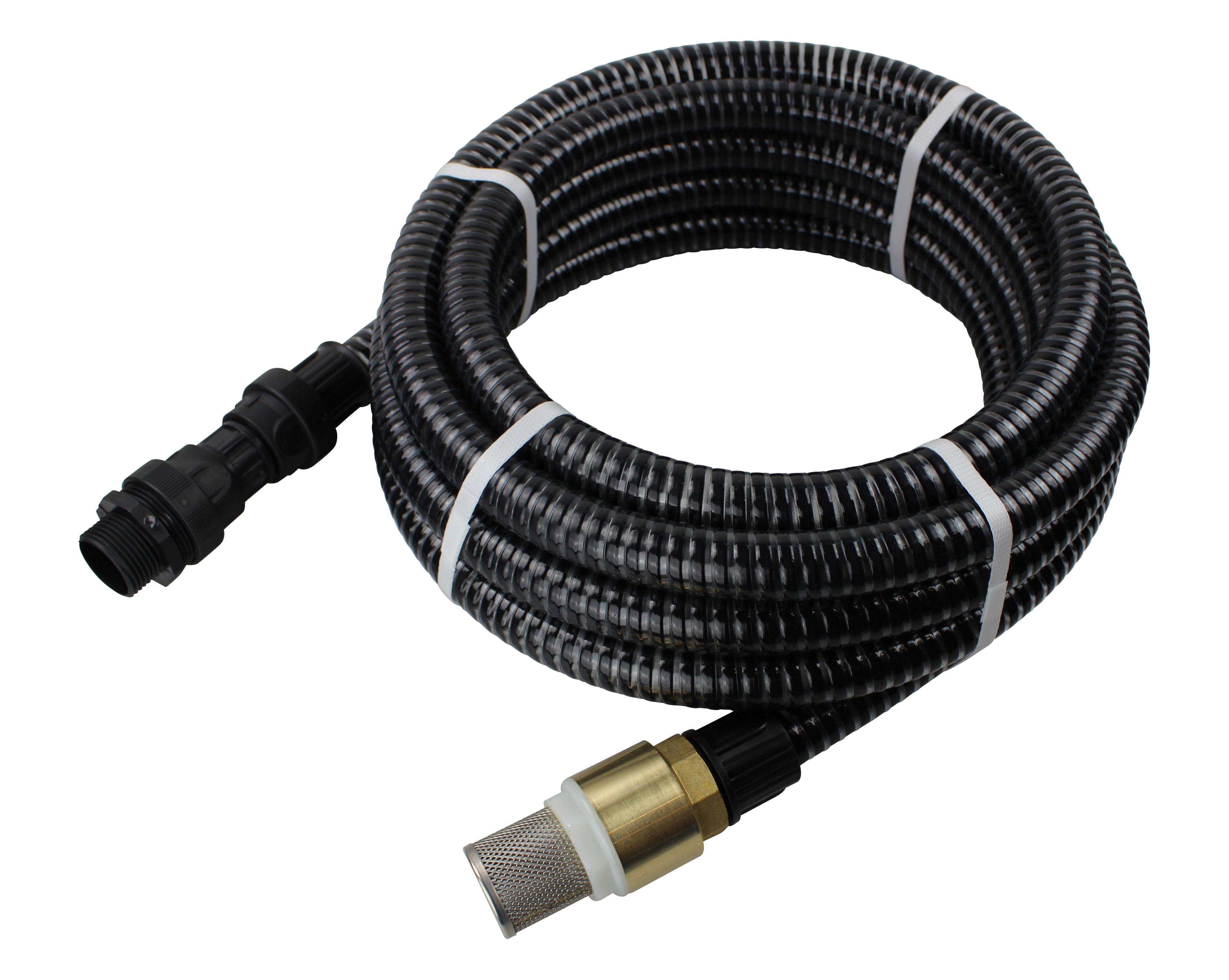Die Ansaugschlauchgarnitur besteht aus einem hochwertigen PVC-Schlauch mit stabiler Hart-PVC-Spiraleinlage für Wasser und andere, fettfreie, nicht aggressive Flüssigkeiten, einem Filterkorb (Edelstahlsieb) mit Rückschlagventil (Messing) und einer Anschlußverschraubung mit 1" Aussengewinde.