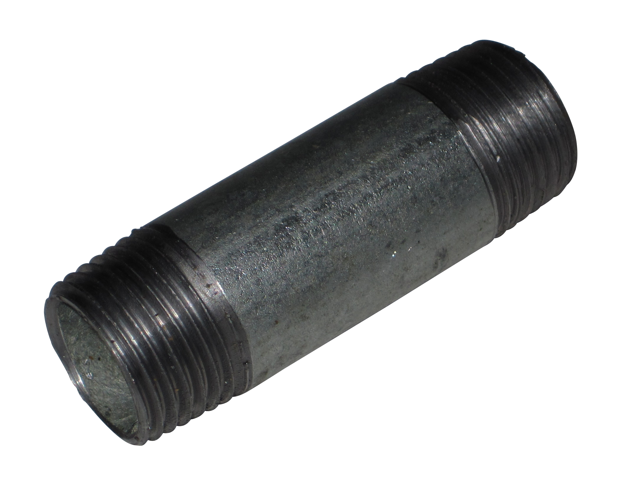 Rohrnippel aus verzinktem Temperguss. Dieser verfügt auf beiden Seiten über ein Außengewinde in der gleichen Gewindegröße.